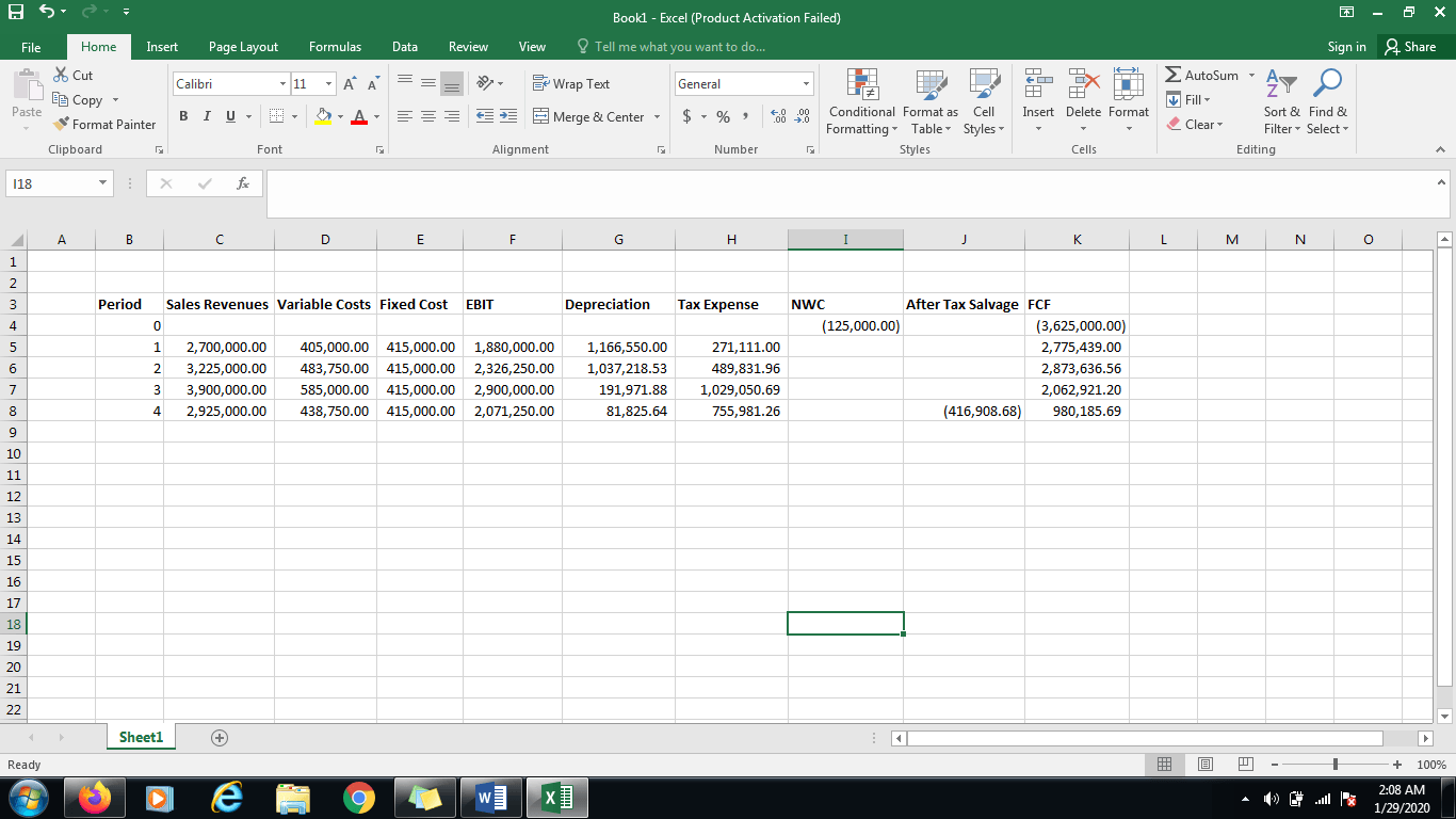NPV = [CF1/(1+r)+CF2/(1+r)^2+CF3/(1+r)^3+…+CFn/(1+r)^n]-Initial Outlay [2,775,439/(1+13%)+2,883,636.56/(1+13%)^2+2,062,921.20/(1+13%)^3+980,185.69/(1+13%)^4]-3,625, 00.00